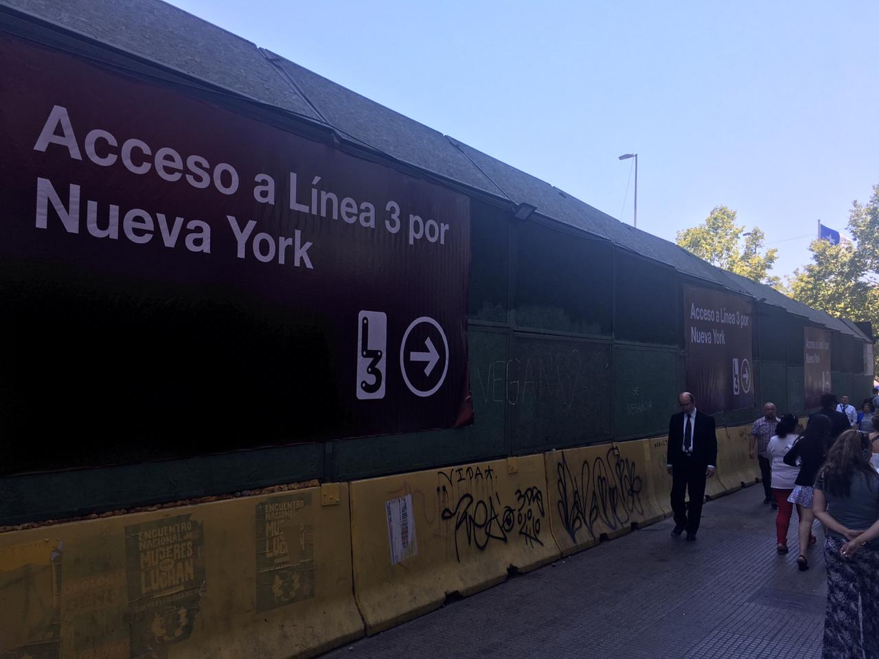 Al transitar por Catedral con Bandera, en pleno centro de Santiago, está uno de los ingresos a la estación Plaza de Armas de la Línea 3, pero en la superficie se aprecia una construcción a medio terminar, cerradas por paneles verdes que tienen señaléticas que indican el acceso al metro.