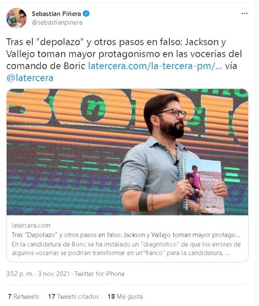 En primera instancia, retuiteó una nota periodística titulada "Tras el 'depolazo' y otros pasos en falso': Jackson y Vallejo toman mayor protagonismo en las vocerías del comando de Boric".