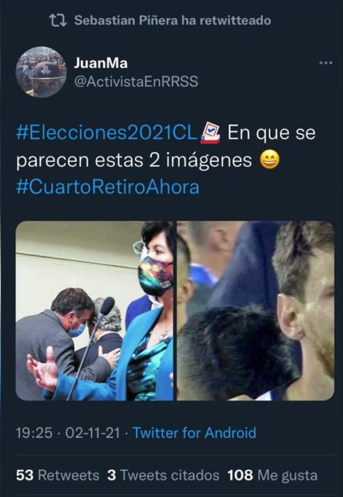 No obstante, lo que causó más revuelo, fue que minutos más tarde compartiera un meme en el cual se burlan de la candidata a la presidencia del Nuevo Pacto Social, Yasna Provoste, y el escenario de incertidumbre que existe en el Senado por el cuarto retiro.