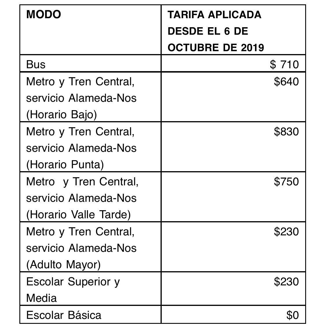 Lee también: ISP ordena el retiro de medicamentos con Ranitidina por presencia de sustancia con potencial cancerígenoEn concreto, será un aumento de $30 en Metro y Tren Central Alameda-Nos, tanto en horario punta como el valle.