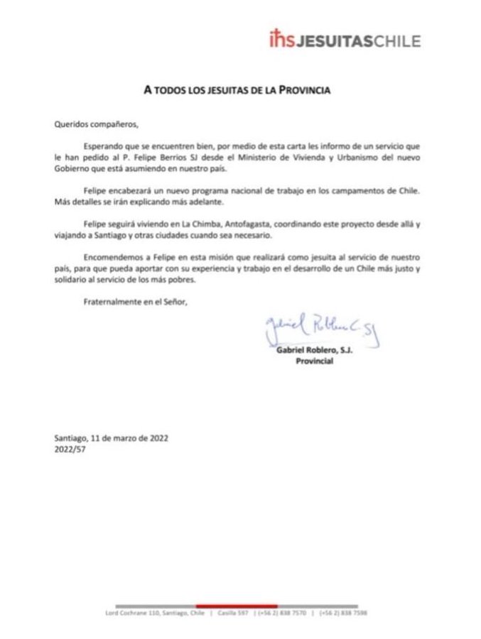 Cabe recordar que el anuncio del nuevo puesto que ocuparía el religioso no se dio de manera oficial, sino que a través de una carta que emitió la congregación a la cual pertenece el jesuita, Felipe Berríos.