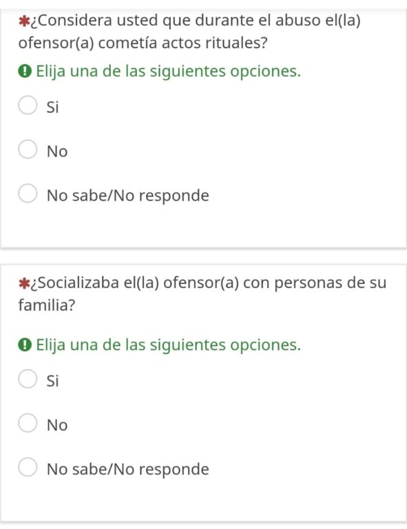 Lee también: Colectivero detenido asegura que adolescente desaparecida se lanzó del vehículo, pero que está muertaEn la encuesta a la que tuvo acceso Radio Bío Bío, se aprecian preguntas sobre el nivel educacional de las víctimas, la edad a la que fueron abusados, si el abusador cometía actos rituales al momento del abuso, además de pedirles evaluar en escala de 1 a 10 qué tan satisfechos o insatisfechos estaban con las eventuales sanciones que se aplicaron a sus agresores, con el proceso de reparación que se les ha ofrecido, entre otros aspectos.