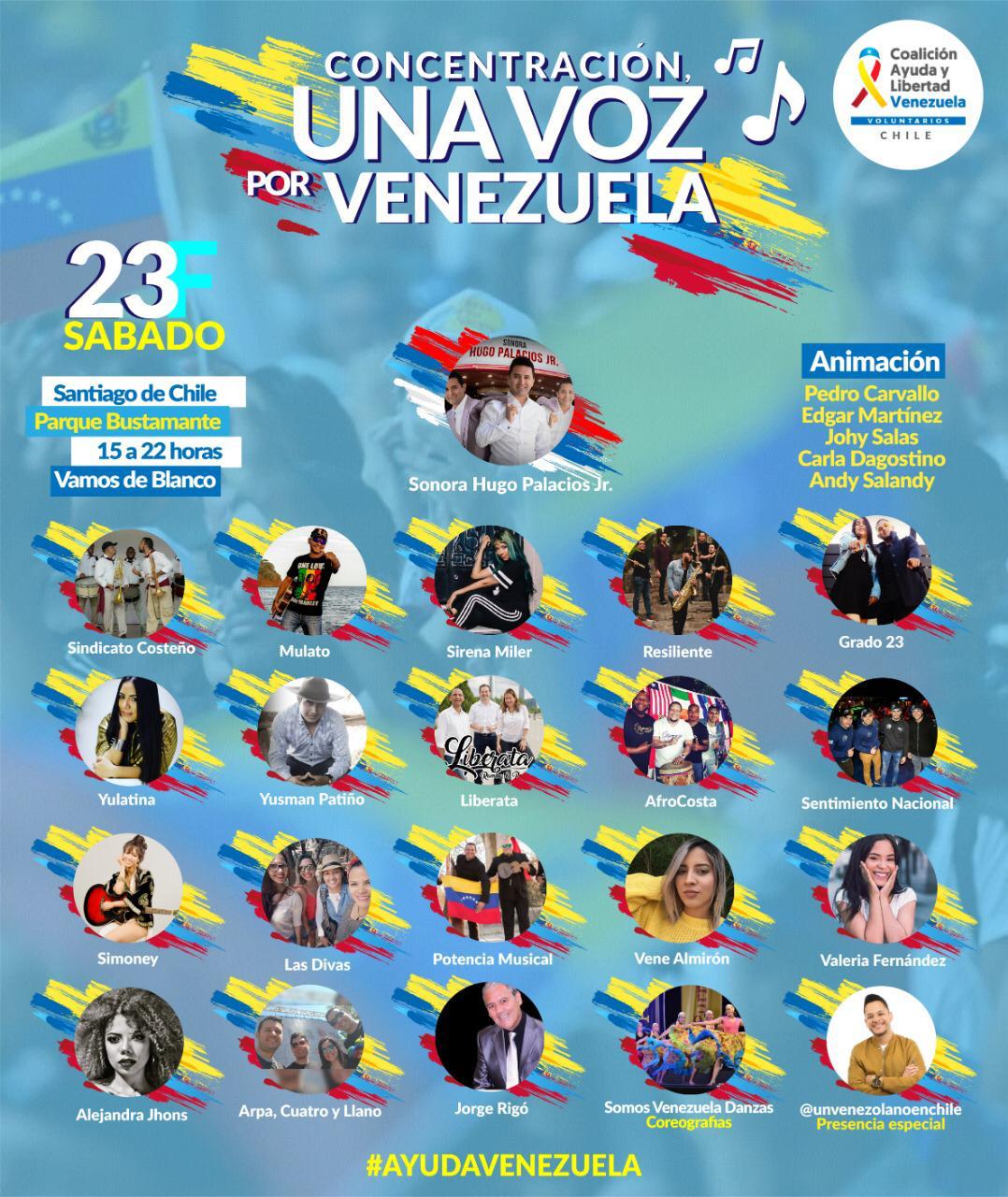 "Una voz por Venezuela" es el nombre del evento que contará con una veintena de shows de artistas chilenos y venezolanos que se presentarán en apoyo al ingreso de la ayuda humanitaria al país gobernado por Nicolás Maduro.