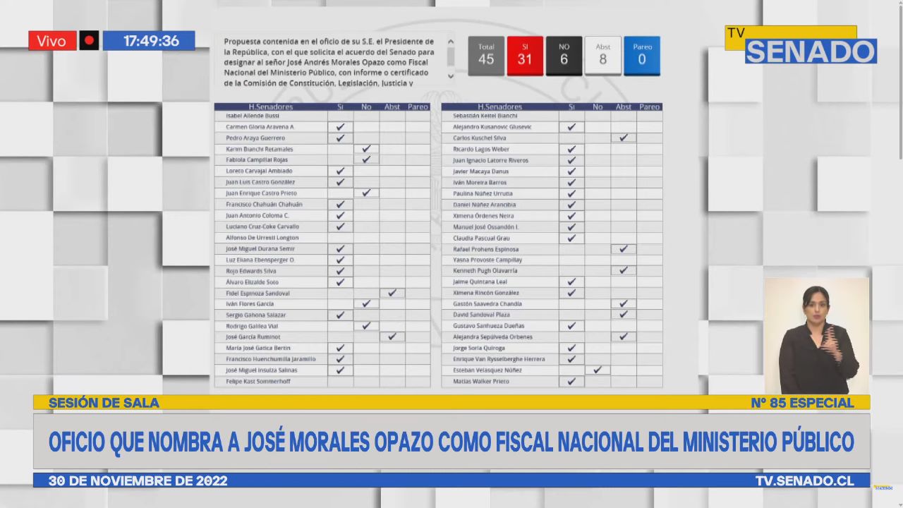 RECHAZADO📝| Sala del Senado rechazó oficio Presidencial que nombra a José Andrés Morales Opazo como Fiscal Nacional, por no alcanzar quórum de 2/3.