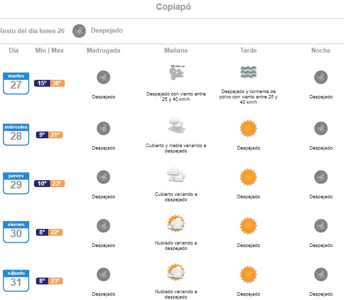 En cuanto a las temperaturas, este martes será el día más cálido en esta nueva ola de calor que recibe la zona con registros que rondarían 38 grados al interior de Atacama y 36° en los valles de Tarapacá y Coquimbo.