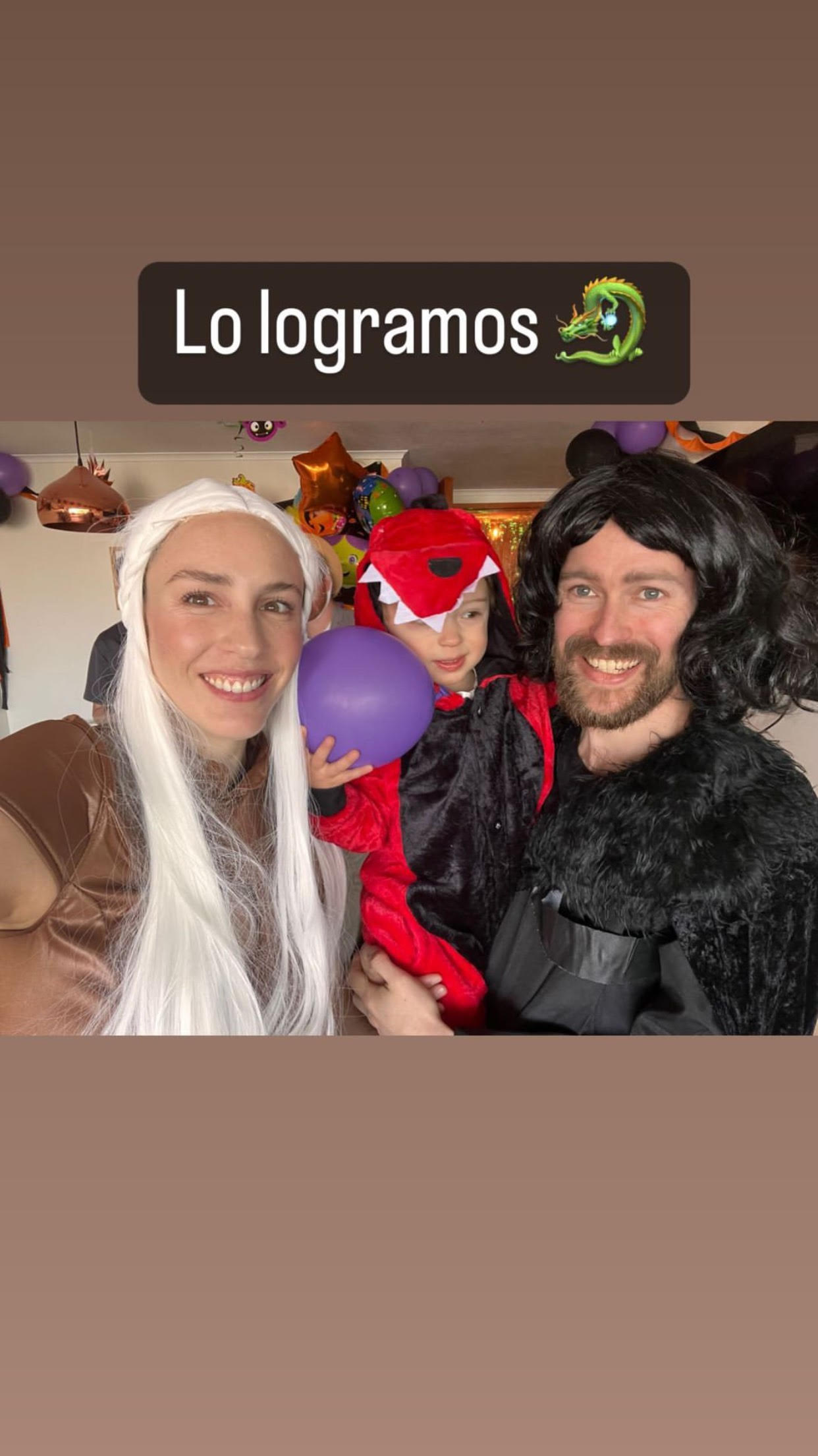 "Falta Drogon, que no quiere usar su disfraz", escribió la influencer en la publicación, vestida como la Khaleesi, mientras que en sus historias se dejaron ver los tres, mientras su pareja está caracterizado como Jon Snow.
