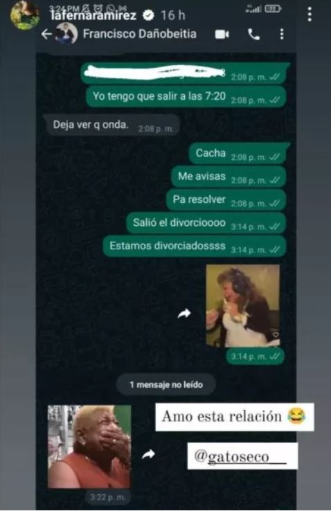 "Amo esta relación": Fernanda Ramírez compartió chat con Francisco Dañobeitía para celebrar divorcio