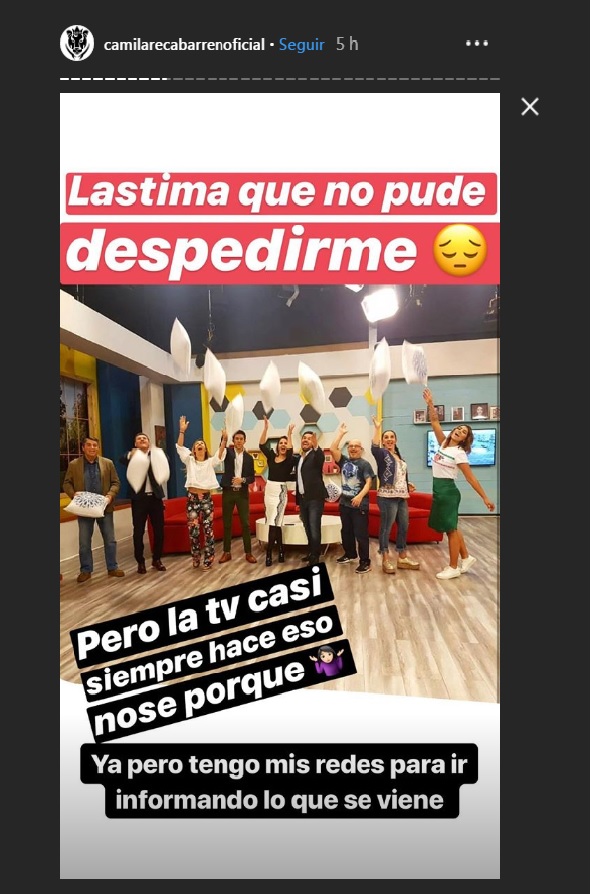 Por medio de las historias de la red social, Recabarren declaró sentirse apenada por no haber tenido la oportunidad de despedirse en pantalla, asegurando que "la televisión es así".