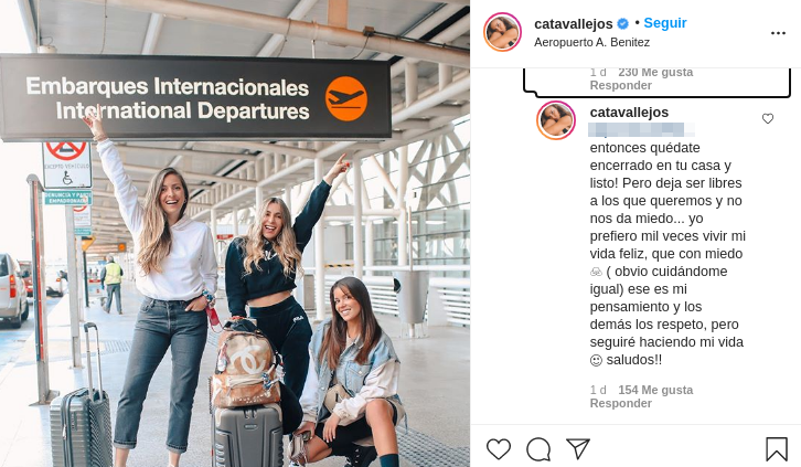 La influencer publicó que viajaría junto a unas amigas, algo que no le gustó a un seguidor. “Espero que después se queden en sus casas para no contaminar a la gente por culpa de sus divertimentos” le escribió.