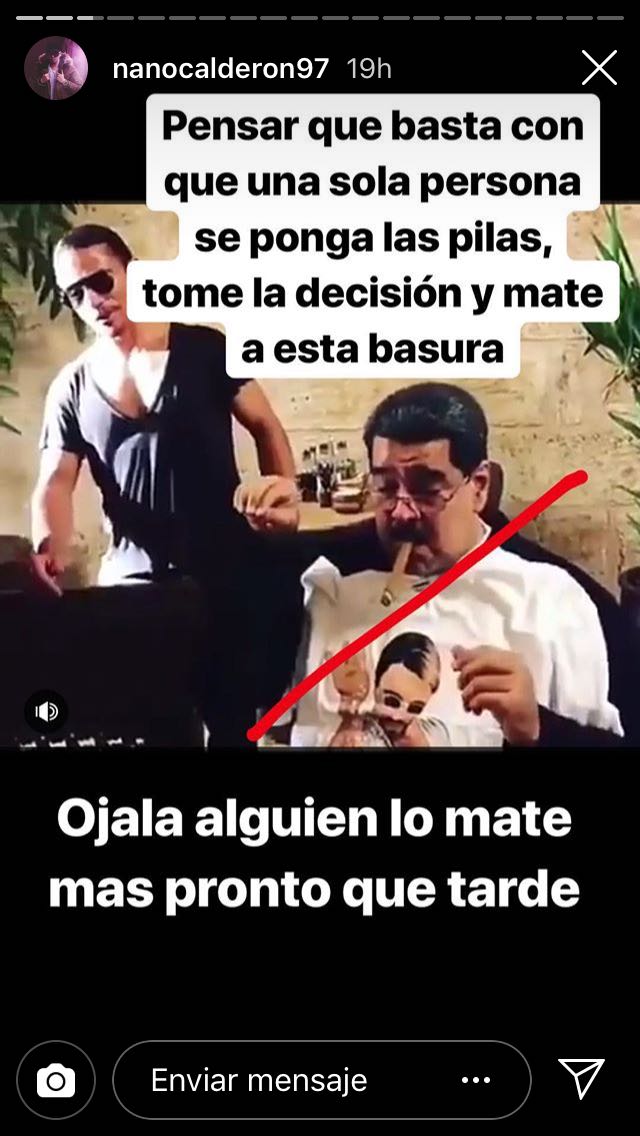 En otra historia de Instagram solicitó que alguien mate al presidente venezolano, Nicolás Maduro. “Pensar que basta con que una sola persona se ponga las pilas, tome la decisión y mate esta basura”, escribió.