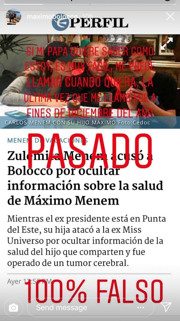 Lee también: El mensaje de Máximo Menem en Instagram para agradecer el apoyo tras su operación cerebralTras esto, Máximo, el hijo de Bolocco y Carlos Memen , publicó en sus historias de Instagram: