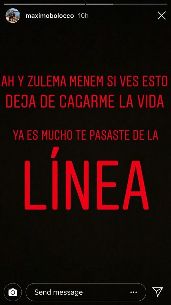 Luego escribió: “Ah y Zulema Menem si ves esto deja de cagarme la vida, ya es mucho. Te pasaste de la línea”.