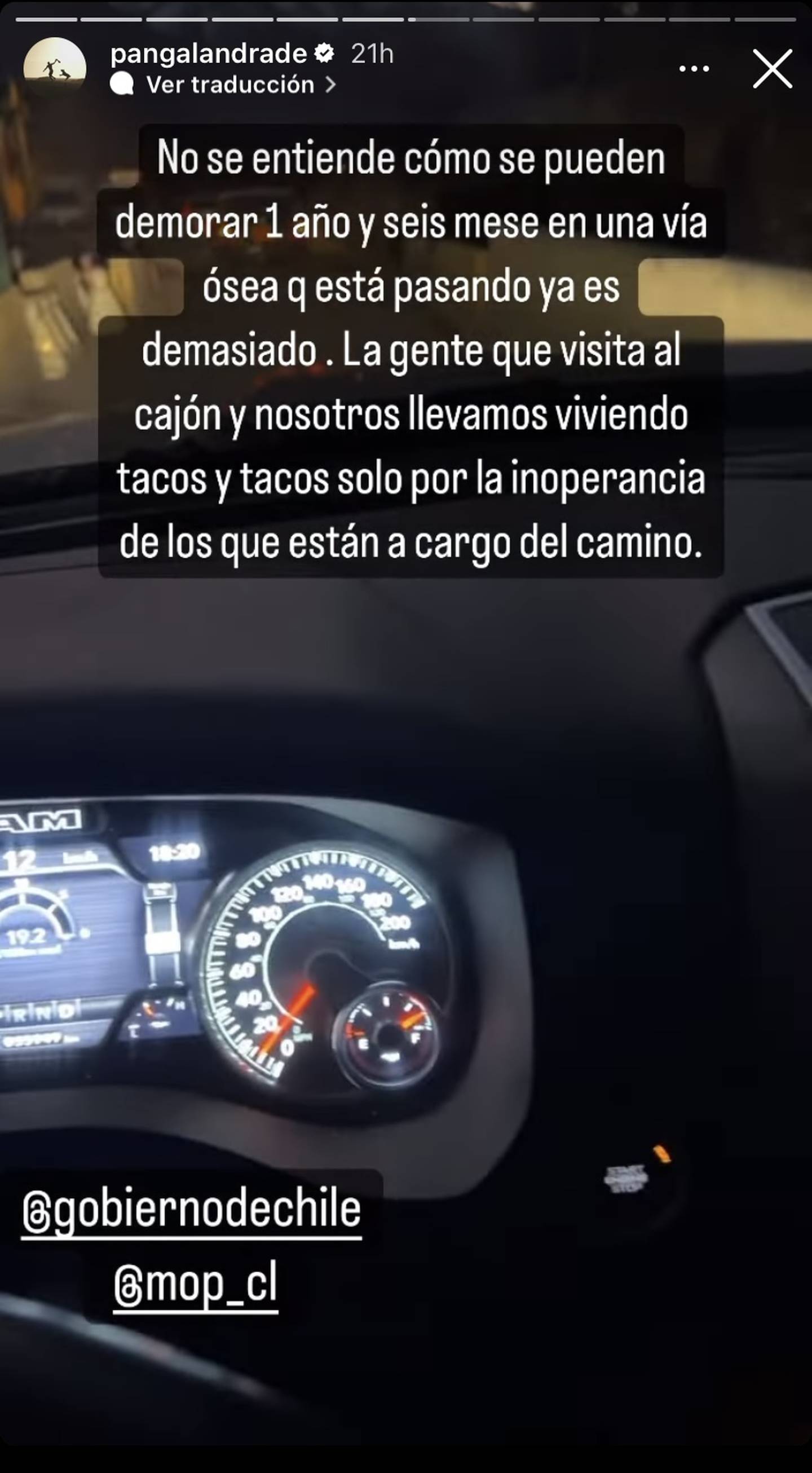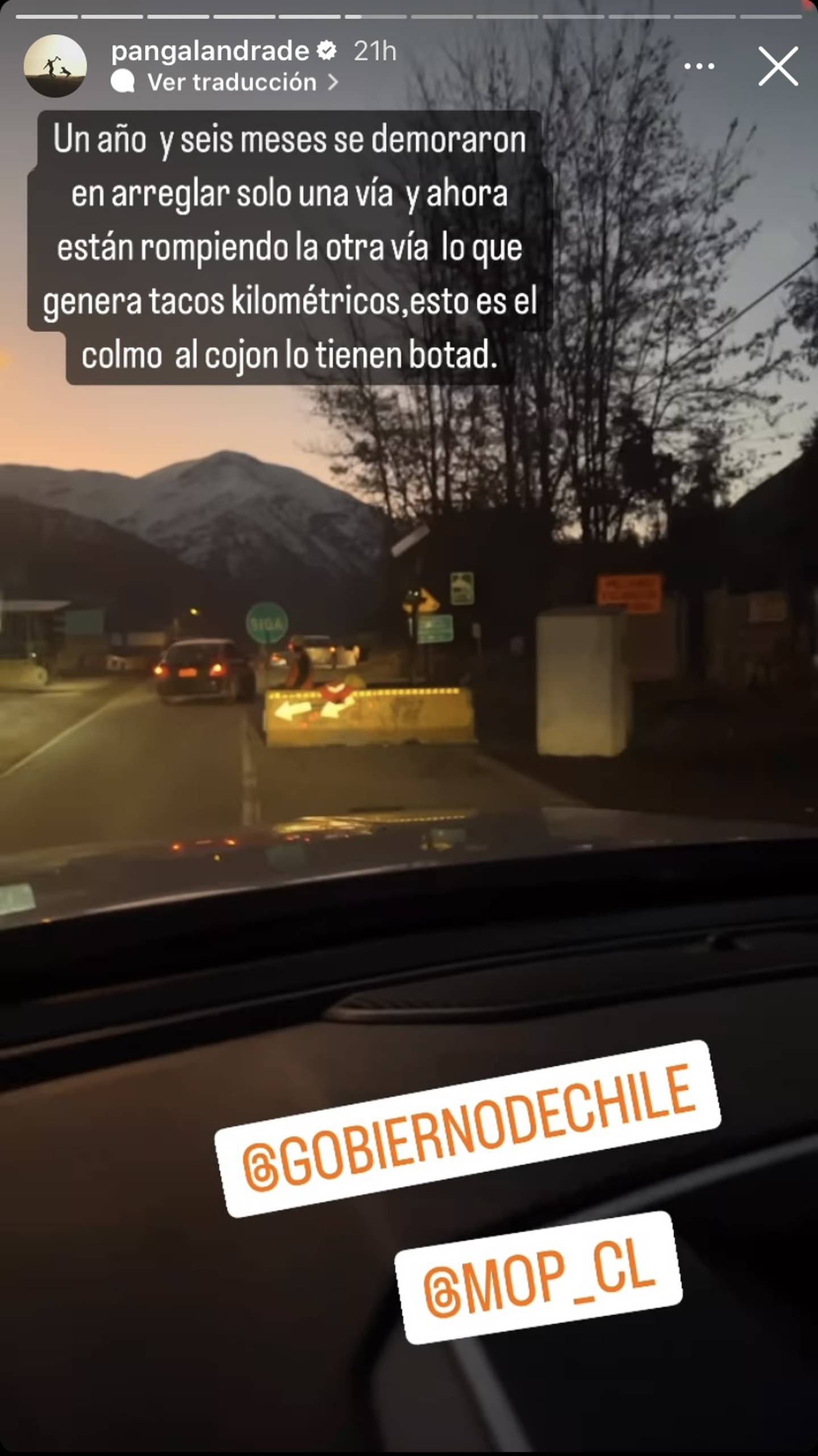 Pangal Andrade utilizó sus redes sociales para emitir un fuerte reclamo en contra del Ministerio de Obras Públicas (MOP), debido a las reparaciones que se están realizando en una de las principales vías del sector de Cajón del Maipo.