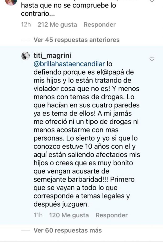 "Lo defiendo porque es el papá de mis hijos y lo están tratando de violador, cosa que no es. Y menos con temas de drogas. Lo que hacían en sus cuatro paredes ya es tema de ellos", dijo Titi Magrini.
