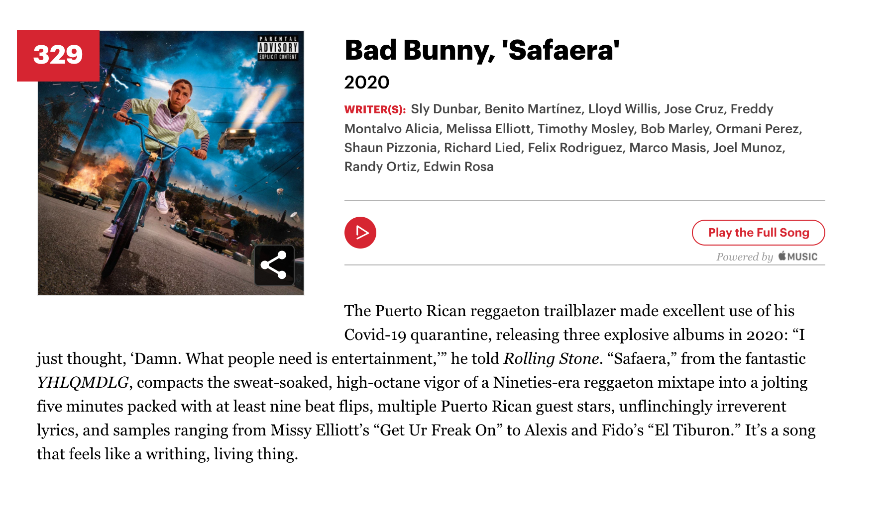 Asimismo, es la primera canción de reaggetón incluida en la lista de la revista Rolling Stone en su historia, superando incluso a singles de emblemáticas bandas de rock como Guns N' Roses, Pearl Jam y Red Hot Chili Peppers.