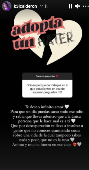 En este contexto, Calderón respondió: "Te deseo infinito amor para que un día puedas sacar todo ese odio y rabia que llevas adentro que a la única persona que le hace mal es a ti".