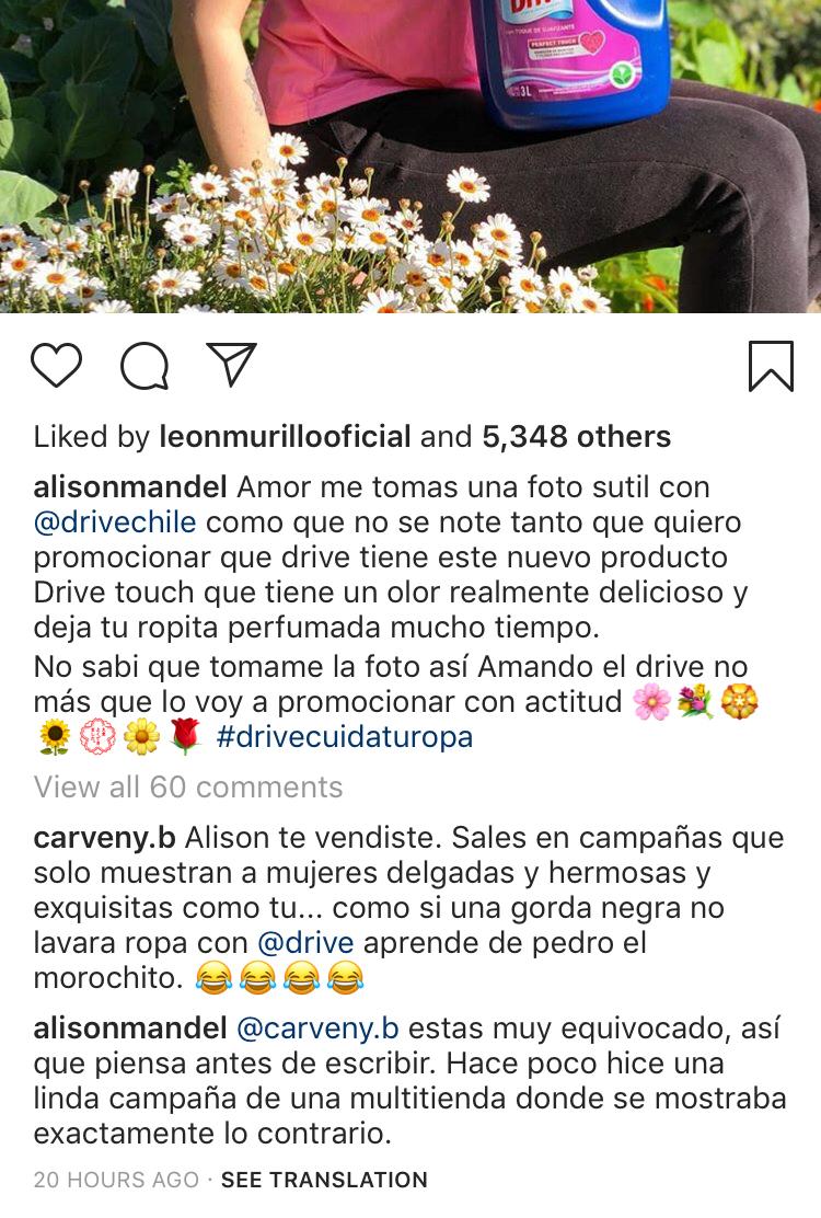 El joven puso: “Alison, te vendiste. Sales en campañas que solo muestran a mujeres delgadas y hermosas y exquisitas como tú... como si una gorda negra no lavara ropa con @drive aprende de pedro el morochito. 😂😂😂😂”, dijo @carveny.b.
