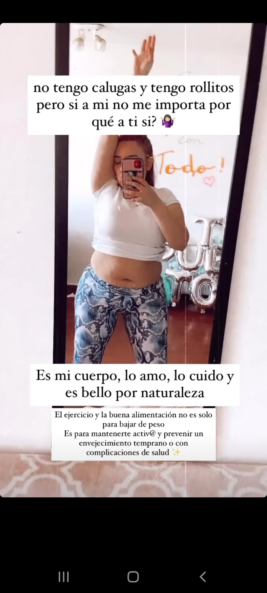 Bajo la misma línea, publicó una foto mostrando su abdomen y escribió: "No tengo calugas, y tengo rollitos, pero si a mí no me importa, ¿por qué a ti sí".