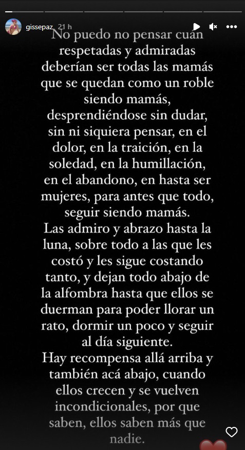 "Las admiro y abrazo hasta la luna, sobre todo a las que les costó y les sigue costando tanto, y dejan todo abajo de la alfombra hasta que ellos se duerman para poder llorar un rato, dormir un poco y seguir al día siguiente", agregó.