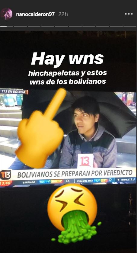 Lee también: Con un emboque: Nano Calderón se burló de Nelson Mauri en redes sociales“Hay weones hinchapelotas y estos weones de lo bolivianos”, escribió. Además, la publicación la acompañó de un Emoji que aparece vomitando.