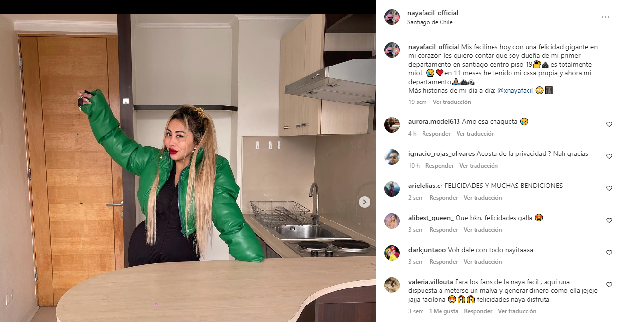 Cabe mencionar que en mayo pasado, Naya informó a sus seguidores que adquirió este departamento ubicado en pleno centro de la capital. "Mis facilines hoy con una felicidad gigante en mi corazón les quiero contar que soy dueña de mi primer departamento en Santiago Centro, piso 19", señaló en ese entonces.