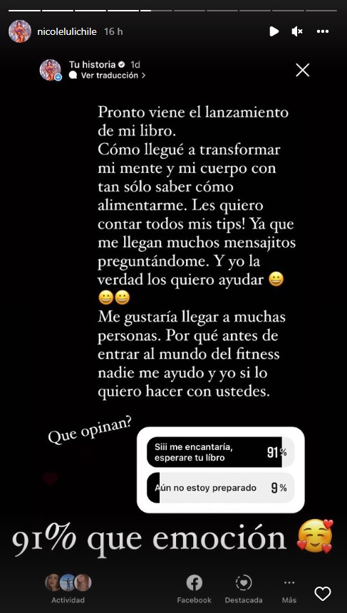 Incluso, Luli hizo una encuesta en la misma red social para ver qué tanto respaldo tenía, obteniendo un contundente de apoyo ya que el 91% votó por la opción “sí, me encantaría. Esperaré tu libro”, mientras que solamente 9% optó por “aún no estoy preparado”.