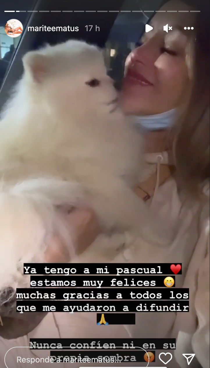 Pero afortunadamente este sábado tuvo una noticia que permitió devolver la alegría a su hogar. Según comunicó en sus historias de Instagram, lograron recuperar al can de raza pomeriana y así culminar con tantos días de incertidumbre.