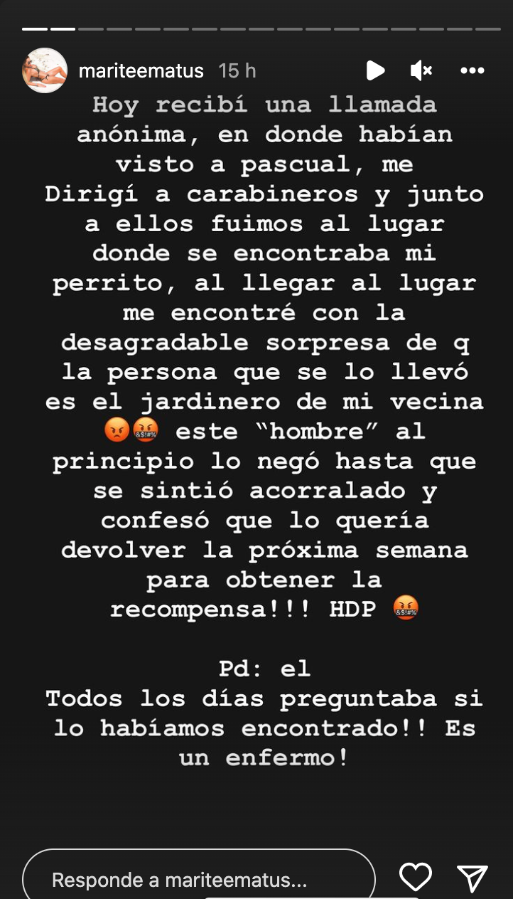 Posteriormente entregó más detalles de lo ocurrido y aclaró ciertas dudas de cómo pudo recuperar a su mascota. "Hoy recibí una llamada anónima en donde habían visto a Pascual. Me dirigí a Carabineros y junto a ellos fuimos al lugar donde se encontraba mi perrito. Al llegar me encontré con la desagradable sorpresa de que la persona que se lo llevó es el jardinero de mi vecina".