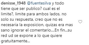 Posteriormente, Fuentes remató: “He visto tu mensaje, pero es mi deber decirte que si de verdad estás pasando por lo que dices y si de verdad quieres arreglar lo que ocurre vuélcate al mundo real. Este es virtual. Dedícate en lo concreto y deja de perder tiempo pidiendo fotos inútiles de mi o de cualquiera con un letrero. Por último, toma en cuenta qué hay iniciativas más relevantes para el planeta que podrían necesitar ese espacio de difusión que tú hoy solicitas. Te deseo larga y buena vida. Sé feliz en el mundo real. En este, los filtros hacen parecer feliz cualquier cosa. (Este mensaje llegó de forma pública, por eso la respuesta la hago abierta)”.
