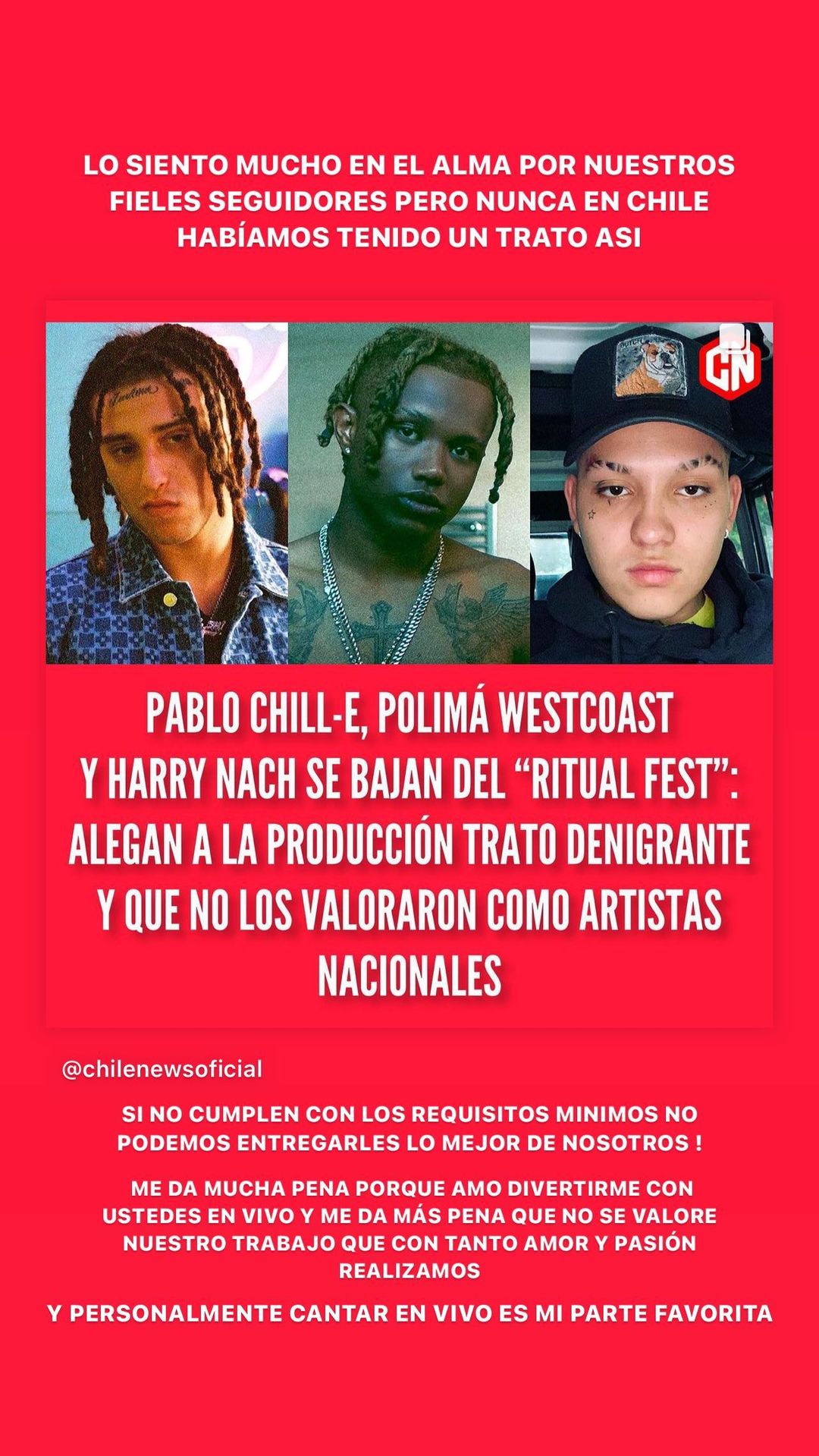 El artista urbano decidió restarse del evento junto a Pablo Chill-E y Harry Nach, acusado un "trato denigrante" por parte de la productora. "Lo siento, pero nunca en Chile habíamos tenido un trato así", expresó.