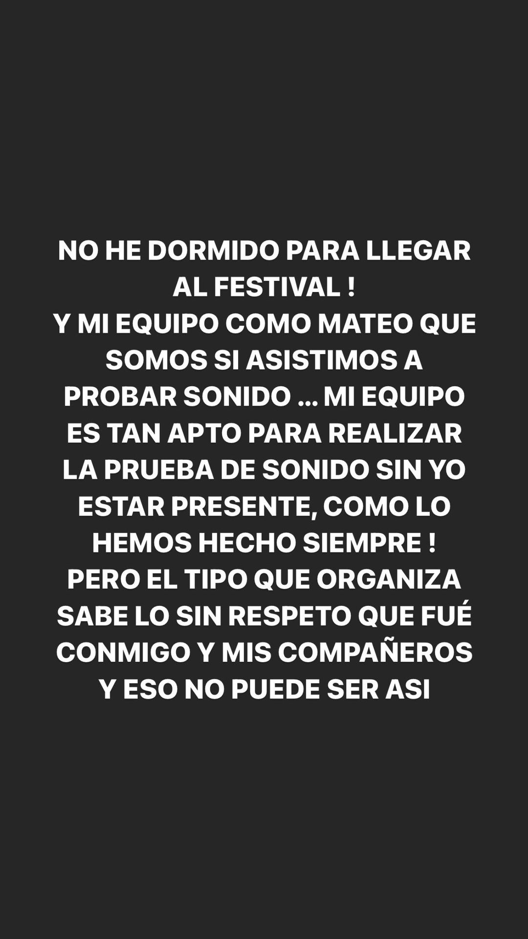 Frente a las acusaciones de no haber asistido a la prueba de sonido, el artista nacional indicó que "no he dormido para llegar al festival y mi equipo, como mateo que somos, sí asistimos a probar sonido".
