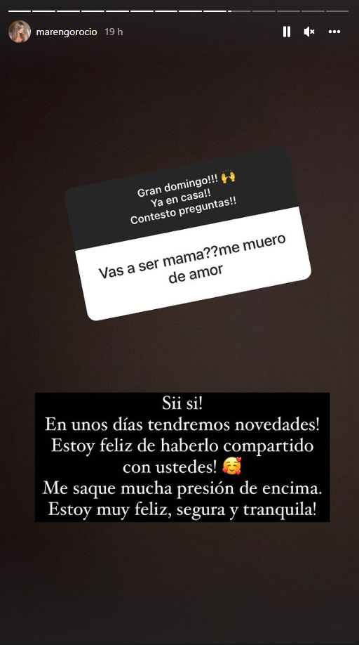 "¡Sí, sí! ¡En unos días tendremos novedades! Estoy feliz de haberlo compartido con ustedes. Me saqué mucha presión de encima. Estoy muy feliz, segura y tranquila", respondió.