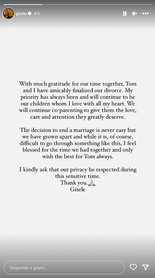 Luego de que la noticia acaparara rápidamente las portadas de los diferentes medios internacionales, tanto Gisele como Tom acudieron a sus redes sociales para dar a conocer su decisión.