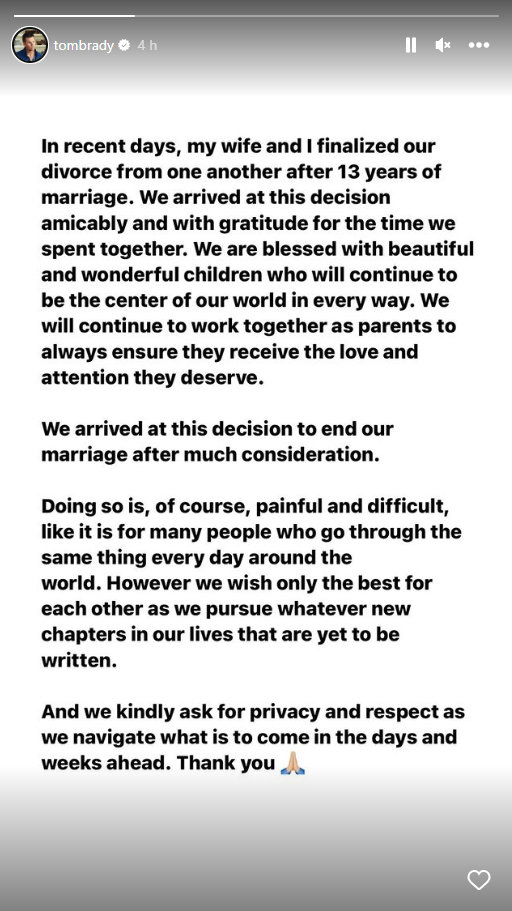 Por su parte, Brady confirmó que "en los últimos días, mi esposa y yo finalizamos nuestro divorcio después de 13 años de matrimonio". "Llegamos a esta decisión amigablemente y con gratitud por el tiempo que pasamos juntos", continuó.