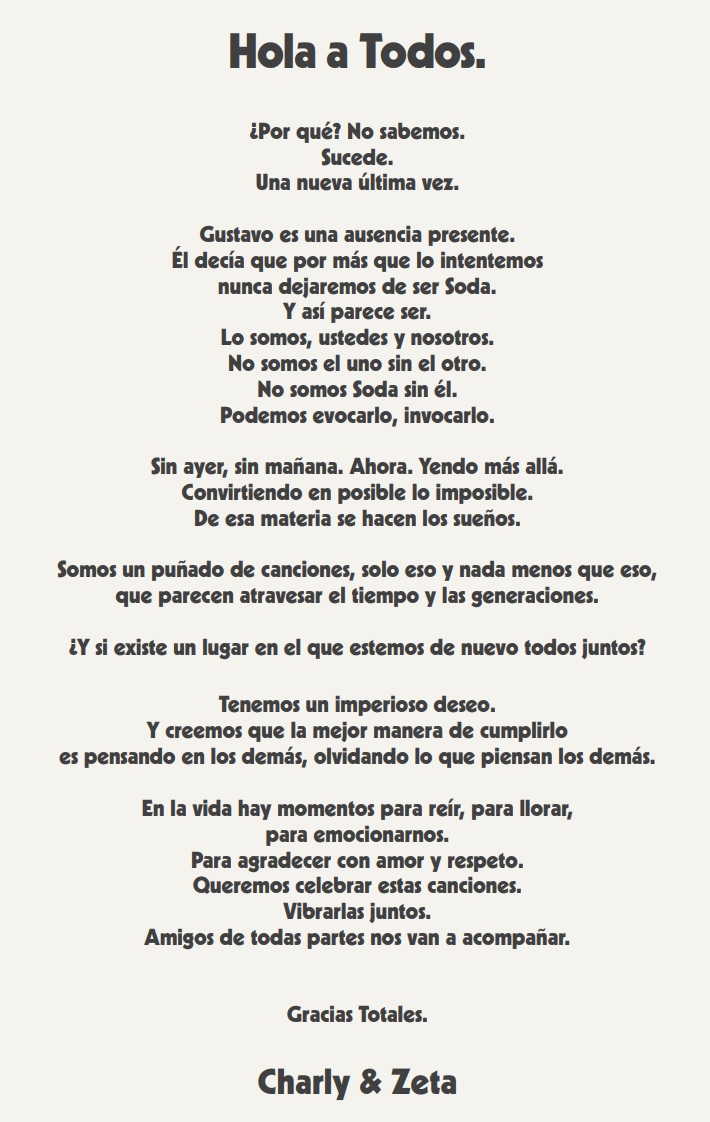 "En la vida hay momentos para reír, para llorar, para emocionarnos. Para agradecer con amor y respeto. Queremos celebrar estas canciones. Vibrarlas juntos. Amigos de todas partes nos van a acompañar", señalan Bosio y Alberti en una carta abierta compartida en sus redes sociales, para anunciar los planes del tour Gracias Totales Soda Stereo 2020.