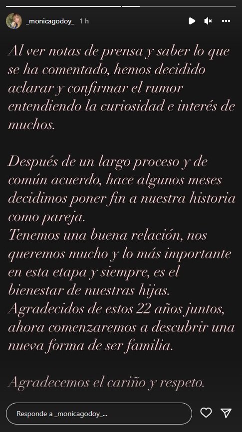 La ahora ex pareja explicó que la determinación se da “después de un largo proceso y de común acuerdo”, señalando que esto no es reciente, sino que data de “hace algunos meses”.