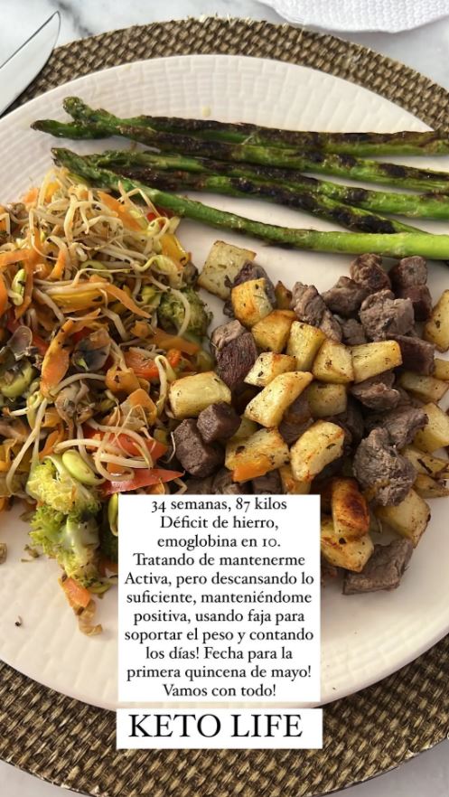 Sobre la misma postal, la influencer contó que tiene "34 semanas, 87 kilos, déficit de hierro, emoglobina en 10". Además, indicó que está "tratando de mantenerme activa, pero descansando lo suficiente, manteniéndome positiva, usando faja para soportar el peso y contando los días".