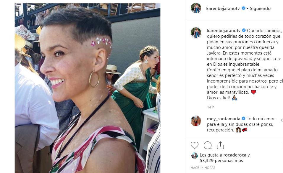 Karen Bejarano también se sumí, pidiendo a sus seguidores que “de todo corazón pidan en sus oraciones con fuerza y mucho amor, por nuestra querida Javiera”.
