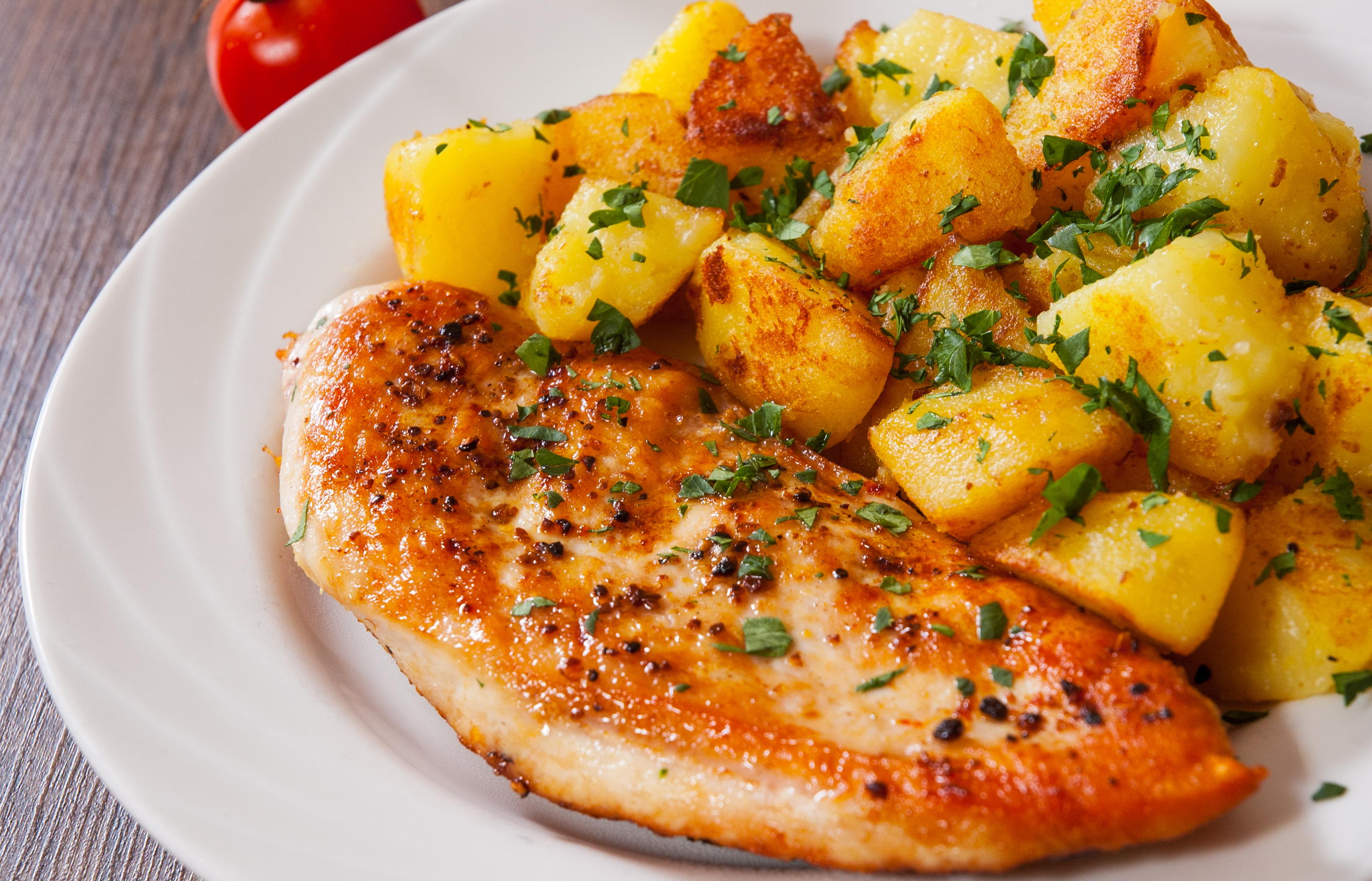 - Sazonar con sal y pimienta. Servir el pollo caliente acompañado de las papas.