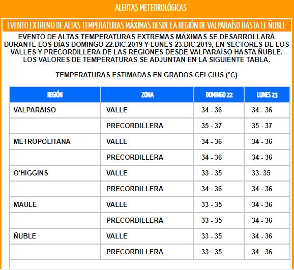 La Dirección Meteorológica de Chile emitió una alerta debido a las altas temperaturas que se registrarán desde la Región de Valparaíso hasta el Ñuble durante este domingo 22 y lunes 23 de diciembre.