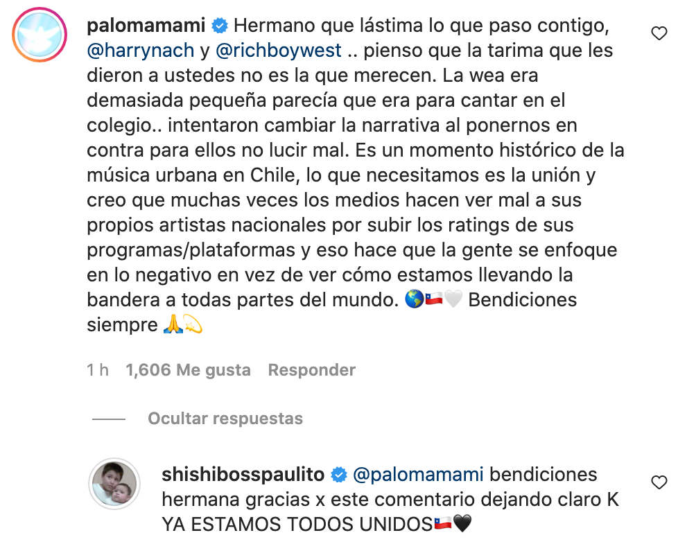 Pablo Chill-E respondió a estas palabras, agradeciendo a la cantante y asegurando que esto deja en claro que "estamos todos unidos".