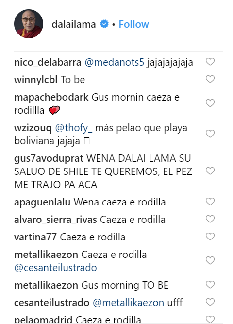 "Caeza e rodilla": Instagram de Dalái Lama se llena de comentarios de chilenos (gentileza de Felipe Avello)