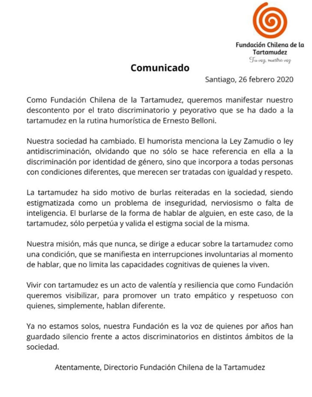 La fundación calificó la actuación como un "trato discriminatorio y peyorativo que se ha dado a la tartamudez". Además, manifestaron su descontento por la mención a la Ley Zamudio.