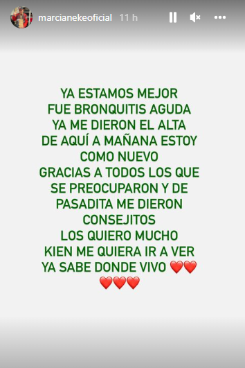 “Ya estamos mejor. Fue bronquitis aguda, pero ya me dieron el alta. De aquí a mañana ya estoy como nuevo”, señaló Marcianeke a través de sus historias en redes sociales, aliviando a sus fanáticos.