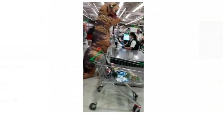 "Sirvió para distraerse de ese bicho": Mujer sorprende con disfraz de dinosaurio en supermercado de La Reina