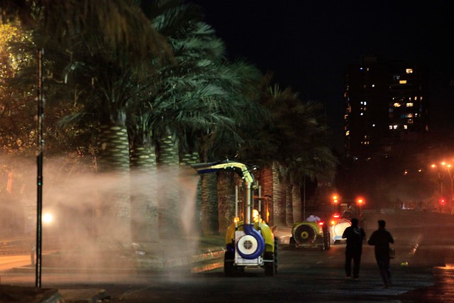 "No basta con echar un chorro de agua con cloro": Sanitizan con tractores las calles más transitadas en la RM