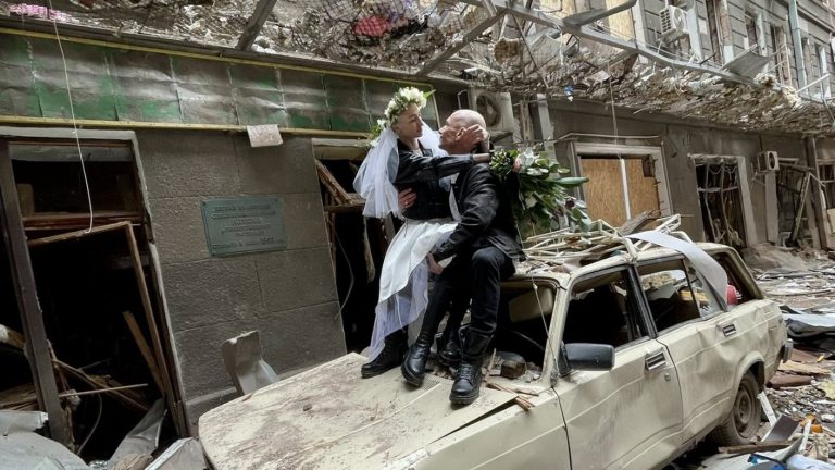 "Hay esperanza y belleza y amor dentro de la fealdad": Novios se unieron en matrimonio entre escombros en Ucrania