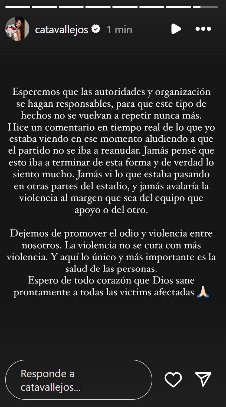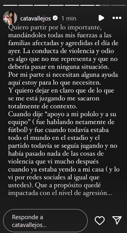 Catalina Vallejos se disculpó públicamente por la historia que subió en apoyo a Independiente, mientras ocurrían los graves incidentes en el Estadio Libertadores de América de Avellaneda entre barristas de Universidad de Chile y del club argentino.