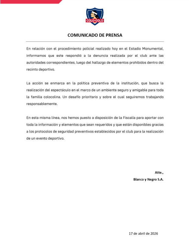 “En relación con el procedimiento policial realizado hoy en el Estadio Monumental, informamos que este respondió a la denuncia realizada por el club ante las autoridades correspondientes, luego del hallazgo de elementos prohubidos dentro del recinto deportivo”, partió indicando el Club en un comunicado de prensa.