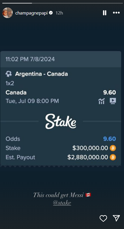 Con miras a la semifinal entre Argentina y Canadá por la Copa América, Drake depositó toda su confianza a The Canucks e hizo una millonaria apuesta.